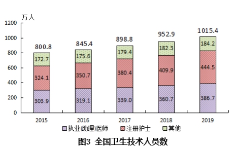 2019年末衛(wèi)生人員總數(shù)中,衛(wèi)生技術(shù)人員1015.4萬人,鄉(xiāng)村醫(yī)生和衛(wèi)生員84.2萬人,其他技術(shù)人員50.4萬人,管理人員54.4萬人,工勤技能人員88.4萬人。衛(wèi)生技術(shù)人員中,執(zhí)業(yè)(助理)醫(yī)師386.7萬人,注冊護士444.5萬人。與上年比較,衛(wèi)生技術(shù)人員增加62.5萬人(增長6.6%)(見表2)。