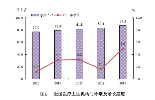 (一)門診和住院量。2019年,全國醫(yī)療衛(wèi)生機構(gòu)總診療人次達87.2億人次,比上年增加4.1億人次(增長4.9%)。2019年居民到醫(yī)療衛(wèi)生機構(gòu)平均就診6.2次。