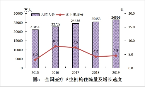 2019年,全國醫(yī)療衛(wèi)生機構(gòu)入院人數(shù)26596萬人,比上年增加1143萬人(增長4.5%),年住院率為19.0%。